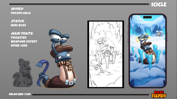 Best Fiends • 7th July 2025 Character Creation + Development: ICICLE Created, conceptualized and wrote the briefs for the game's new characters, collaborating closely with artists.