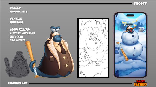 Best Fiends • 22nd July 2025 Character Creation + Development: FROSTY Created, conceptualized and wrote the briefs for the game's new characters, collaborating closely with artists.